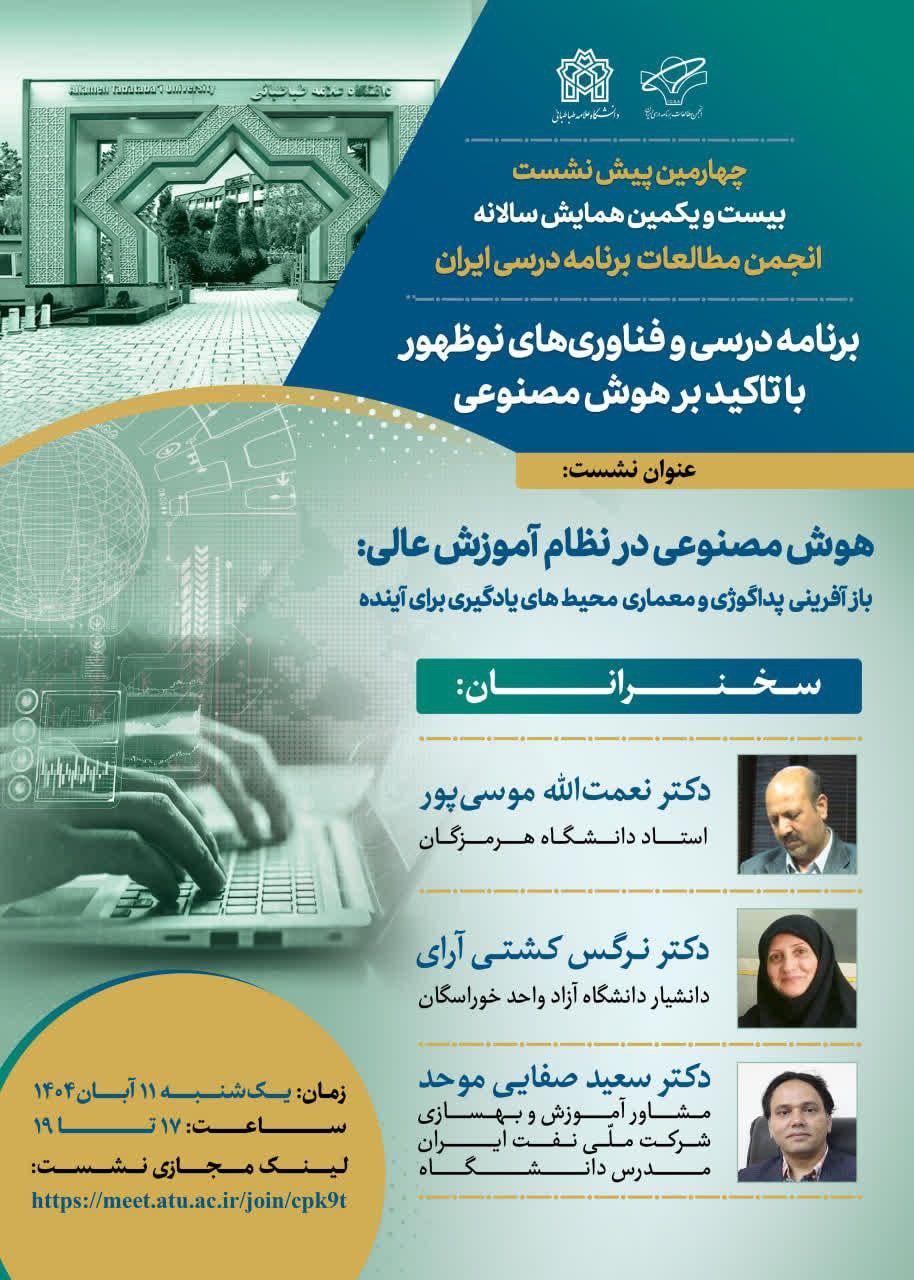 چهارمین پیشنشست بیست و یکمین همایش سالانه انجمن مطالعات برنامه درسی ایران با عنوان «هوش مصنوعی در نظام آموزش عالی: بازآفرینی پداگوژی و معماری محیطهای یادگیری برای آینده» برگزار میشود.